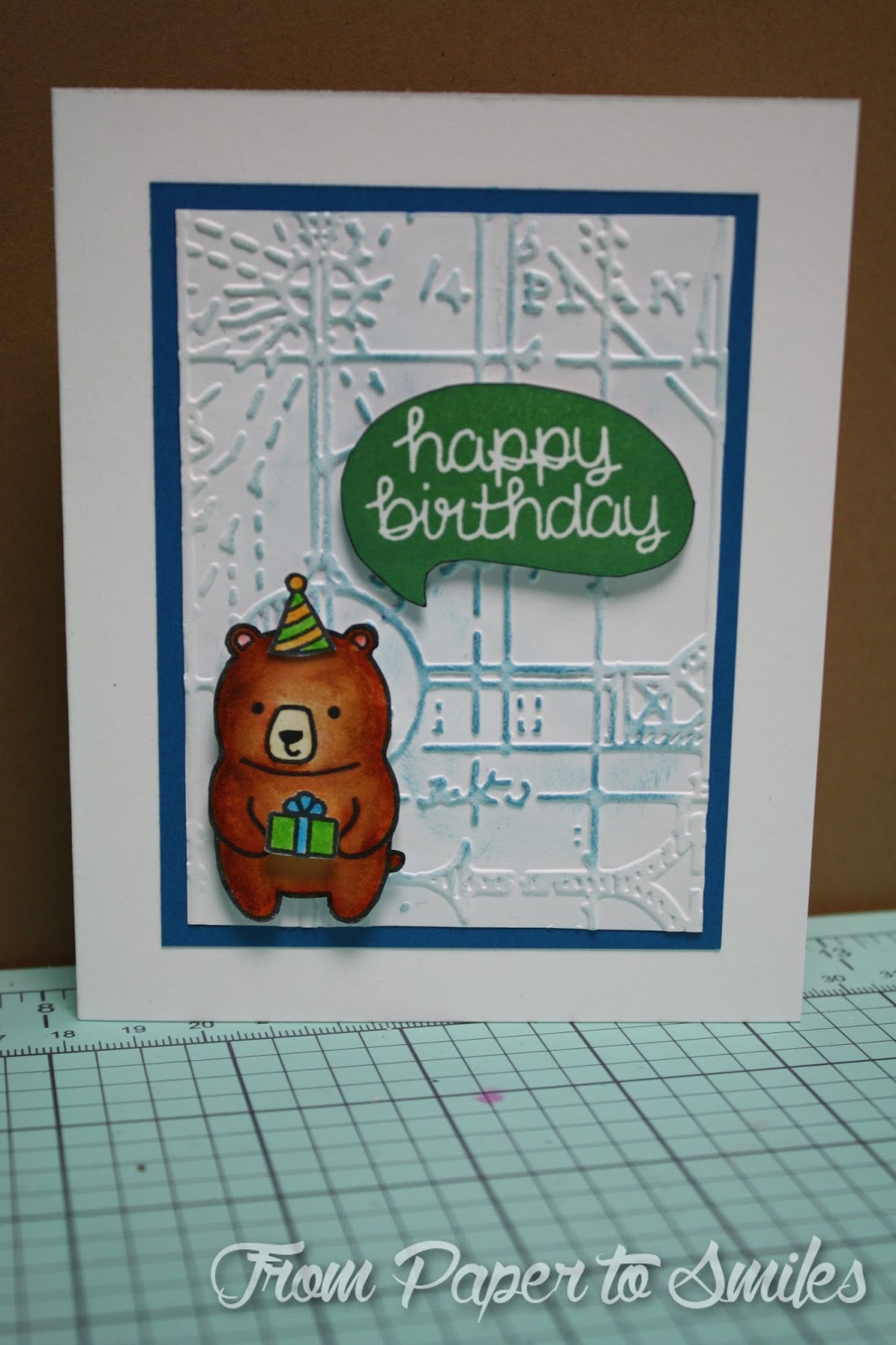 For these birthday cards, I used the same design for both but switched up the colors, images, and the embossing folder I used. First, I started out by using some blueprint/cogs and gear embossing folders from Sizzix. After I dry embossed them, I lightly went over each embossed background with my distress inks using my blending tool to give it more dimension. Next I stamped out my images, colored them (robot: Copics; bear: Zig Clean Color), and then fussy cut them out. I used the Beep Boop Birthday for the cute robot image, and the Party Animal set for the bear; both of which are from Lawn Fawn.