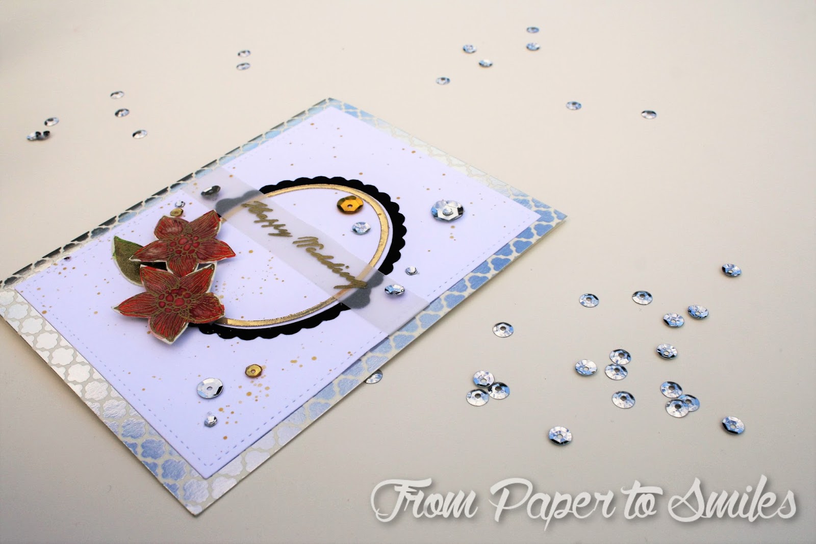 For my finishing touches, I adhered this onto a premade silver foiled patterned card base, and added a scattering of gold and silver sequins throughout. After splattering on some gold and silver watercolor paint, my card was finished.