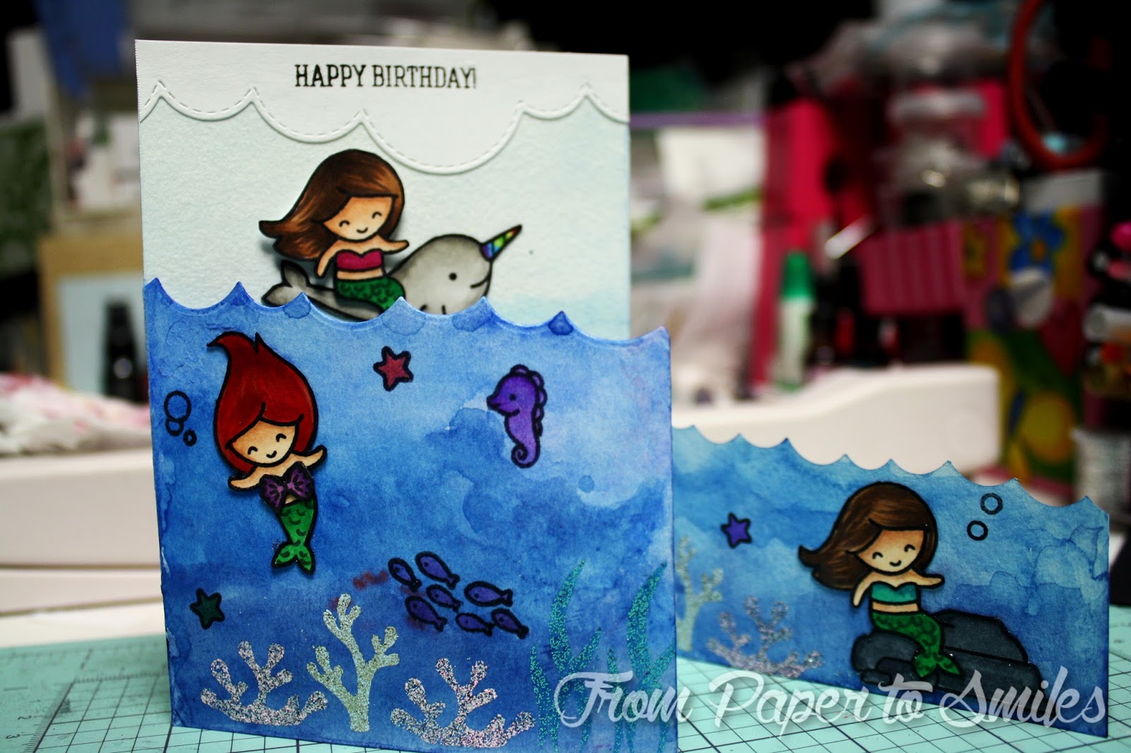 While the base was drying, I stamped out lots of images from Lawn Fawn Mermaid for You set and colored them in using my Copic markers. This process of coloring different mermaids with various hair colors was fun and allowed me to practice my "flicking" hair coloring. After they were all colored in, I fussy cut them out and went over the edges with a black marker.