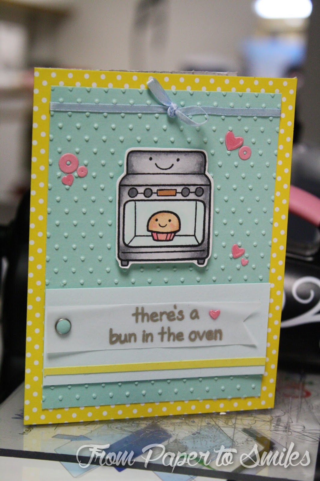 I chose a mint colored cardstock cut at 4" by 5.25" and dry embossed it using my Cuttlebug Swiss Dots folder. Next, on a white piece of card stock, I stamped on the cute oven and bun from Lawn Fawn Plus One stamp set. I colored it in using Copic markers in N2, N4, and N6 and some browns and pinks for the little bun. I fussy cut this out with a thin border and used foam tape to adhere it onto the embossed panel.