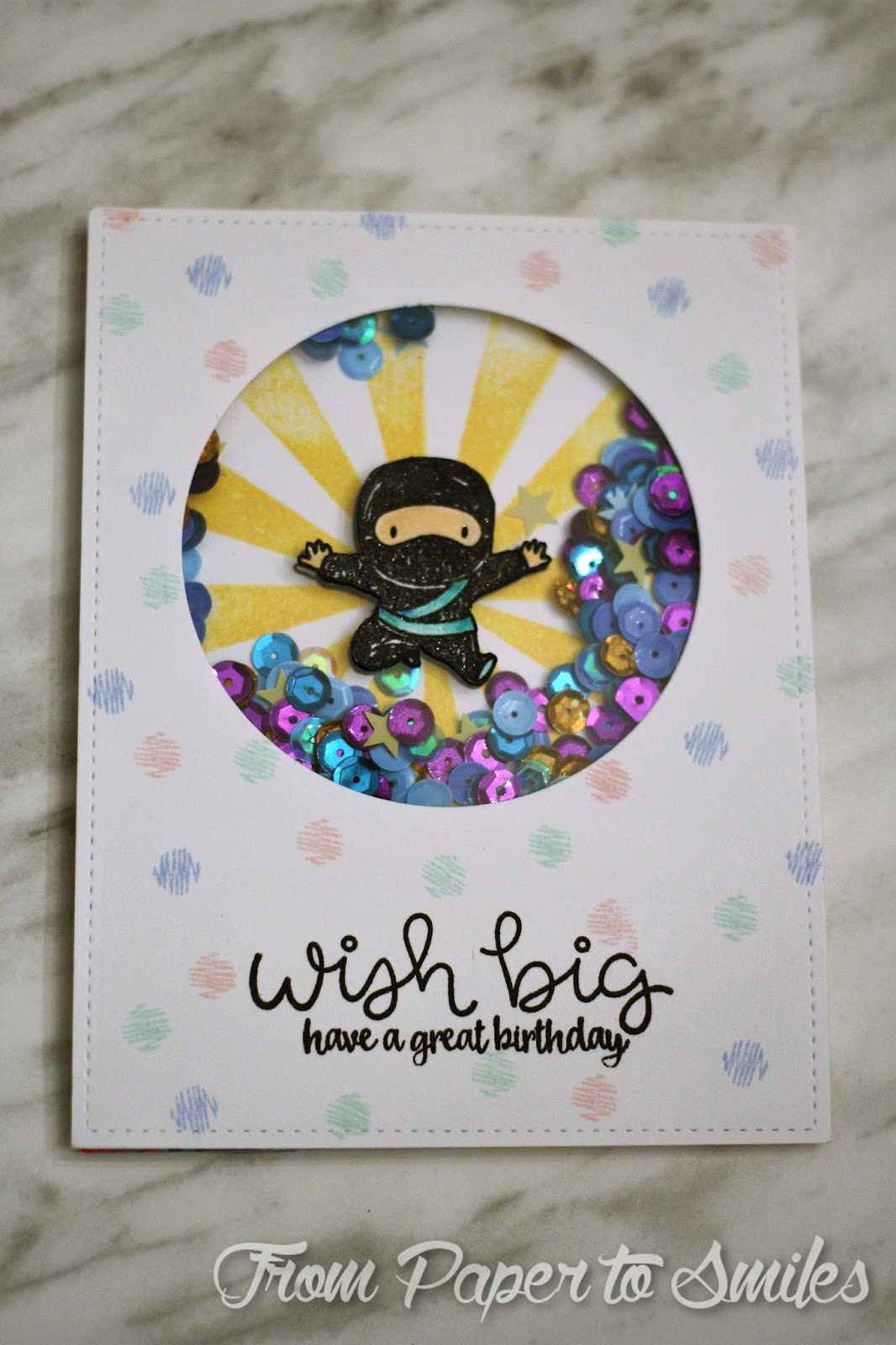Gorgeous shaker card :-) I love the little ninja with the starburst, very cute :-)